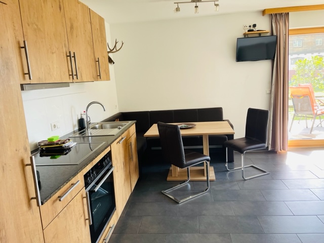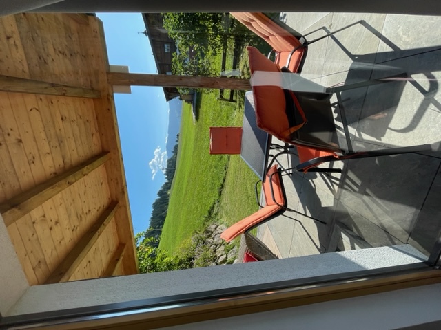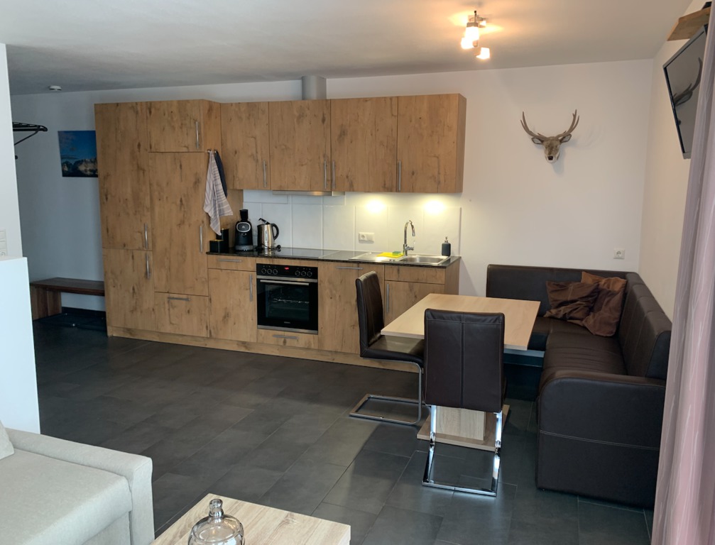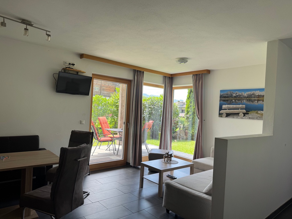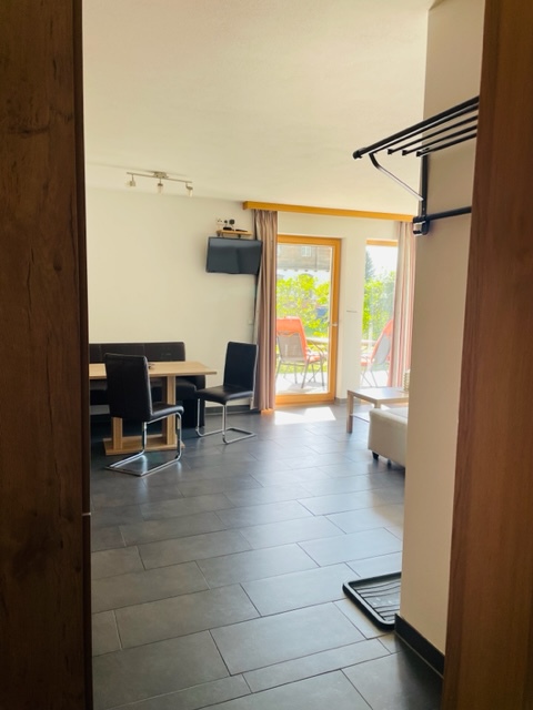 Durch den eigenen Eingang betreten Sie das einladende Wohnzimmer mit bequememEcksofa, Fernseher und fantastischem Blick auf die Berge bzw. die Skipiste.