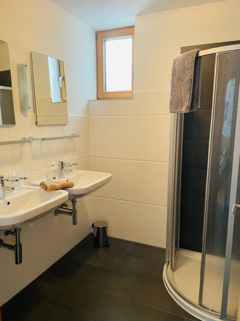 Das Badezimmer bietet ein Doppelwaschbecken, eine Dusche und einen Handtuchwärmer, die Toilette ist separat.