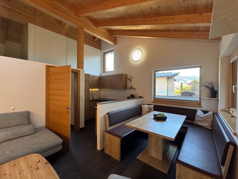 Durch den eigenen Eingang betreten Sie den Flur der in weitere Räume führt. Das gemütliche Wohnzimmer mit Ecksofa, Fernseher und Blick auf den Hang mit Wald und seitlich die Berge bzw. die Skipiste.